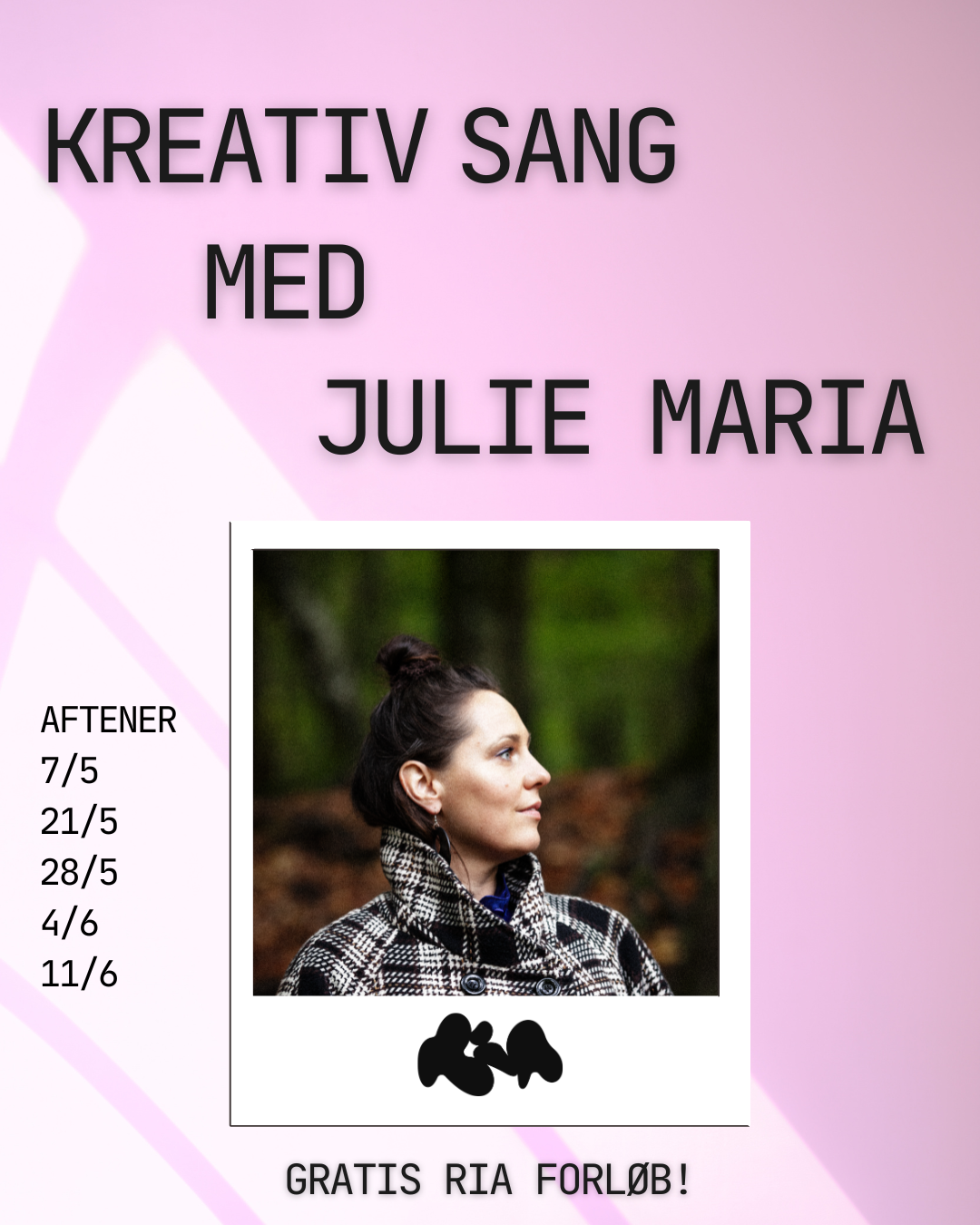 I forløbet ”Kreativ Sang” vil Julie Maria dele sin erfaring som sanger og artist og specielt sætte fokus på sangerkropstræning, også kaldet ”Anne Rosing Metoden”. Du kan læse mere om Sangekroppen via dette link: