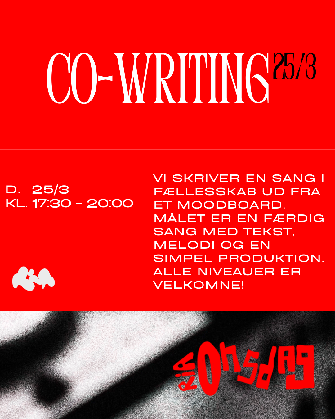 Vi skriver en sang i fællesskab ud fra et givent moodboard. målet er en sang med færdig tekst, melodi og simpel produktion- Alle niveauer er velkommen :-)